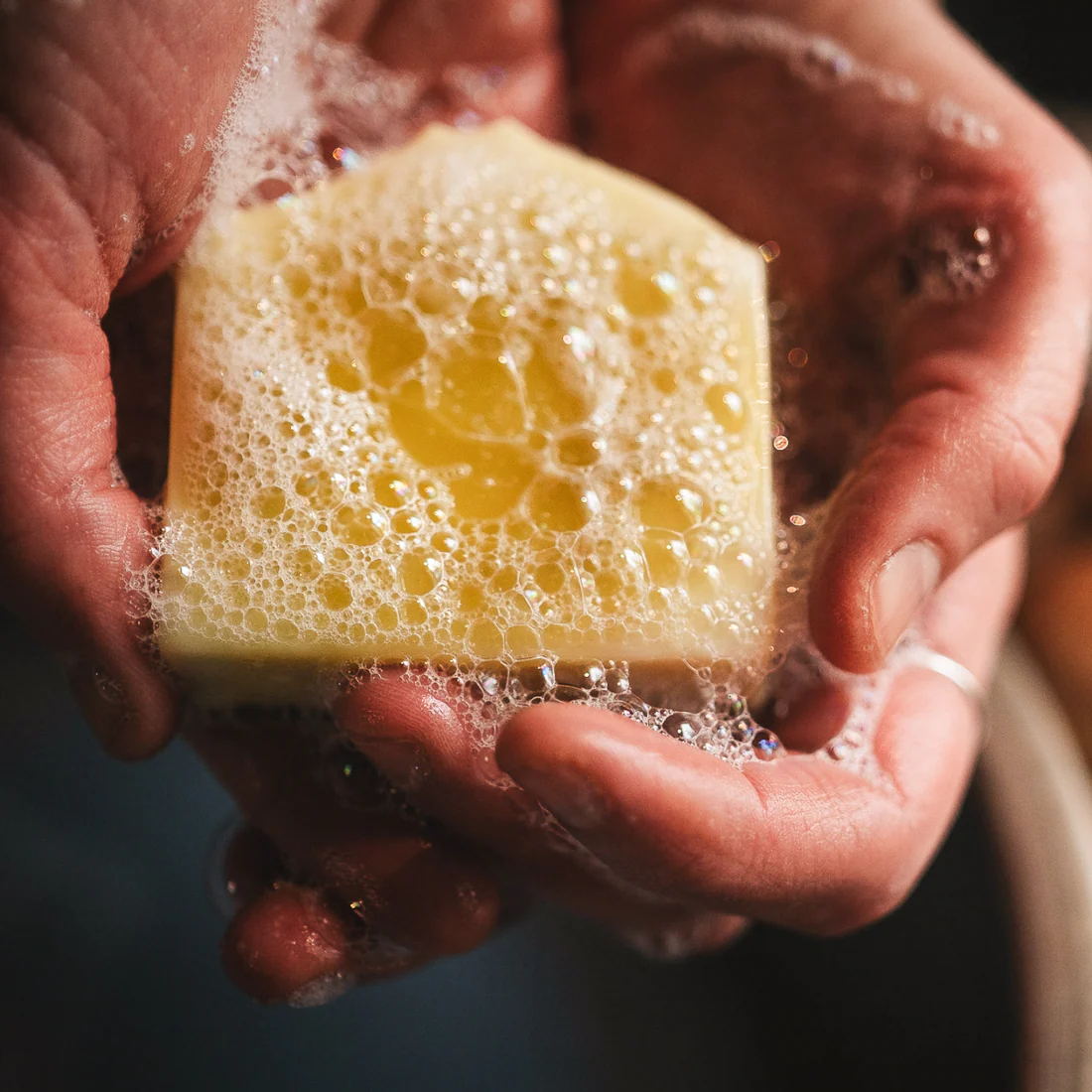 INCI: Sodium Oleum olivae, Sodium Cocos nucifera, Sodium Brassica napus, Humulus Lupulus samt Melaleuca Alternafolia Leaf Oil.